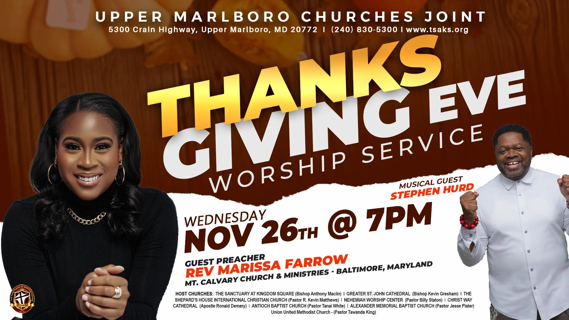 We’re excited about our upcoming Joint Thanksgiving Eve Worship Service on Wednesday, November 26th at 7:00 PM at The Sanctuary at Kingdom Square (5300 Crain Highway, Upper Marlboro, MD). This special night of praise and thanksgiving will feature Guest Preacher Rev. Marissa Farrow of Mt. Calvary Church & Ministries in Baltimore and Musical Guest Stephen Hurd. Let’s come together with our sister churches for a powerful time of worship and gratitude as we thank God for His faithfulness throughout the year! We look forward to worshiping as a church family with others in the body of Christ!