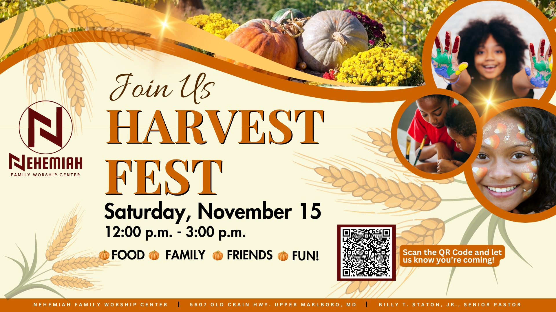 Join us for our annual Harvest Festival, a family-friendly celebration of community, gratitude, and the season's blessings. The festival will take place on Saturday, November 15, 2025, from 12:00 p.m. to 3:00 p.m. at Nehemiah Family Worship Center. Children can enjoy outdoor games and treats, while adults can connect and fellowship with friends and neighbors. Please use the QR code below to register for the event. We look forward to seeing you there. As we prepare for this special gathering, we’re also seeking monetary donations to help make the event even more memorable. Your generous support will go toward enhancing the experience for all who attend. Please see Deacon Sharna Graham or visit the mobile app to donate. For general information about this event, email kingdomkidz@nfwcenter.org. .