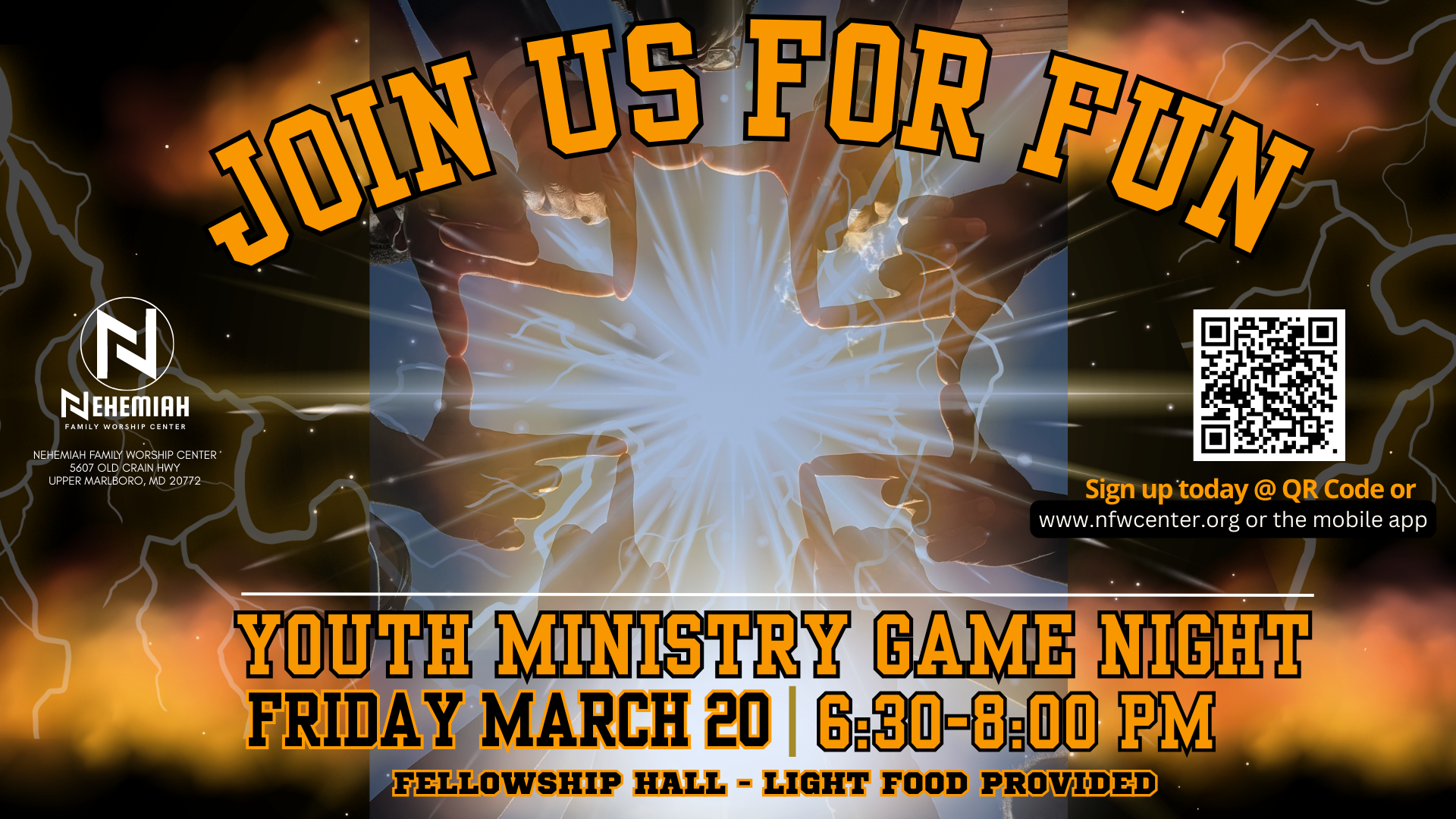 Students 6th through 12th grade, join us for the 1st event of 2026 and enjoy a night of fun games and fellowship! Bring any games you want and invite your friends and family!! We can't wait to see you there! Friday March 20, 2026 from 6:30pm-8pm in the Fellowship Hall. Light dinner will be provided. Sign up now to let us know you’re coming!