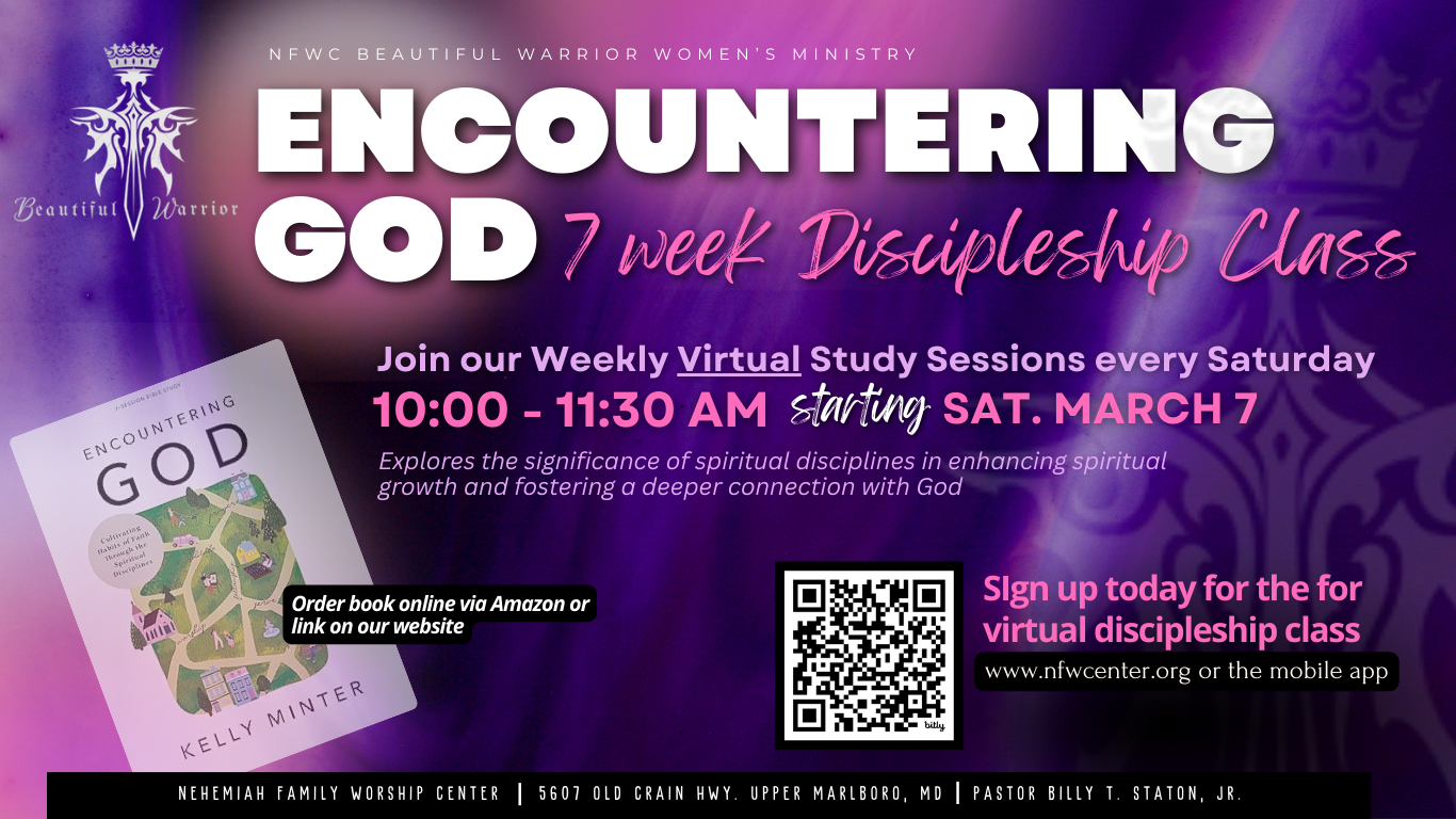 The Beautiful Warrior Women’s Ministry invites you to draw closer to God as we learn about and practice spiritual disciplines. Register today for this 7-week virtual study entitled Encountering God that explores the significance of spiritual disciplines in enhancing spiritual growth and fostering a deeper connection with God. The dates for the sessions are as follows: Weekly, Saturday, March 7th - Saturday April 18th 10AM - 11:30 AM virtual and Saturday, April 25th, in-person
